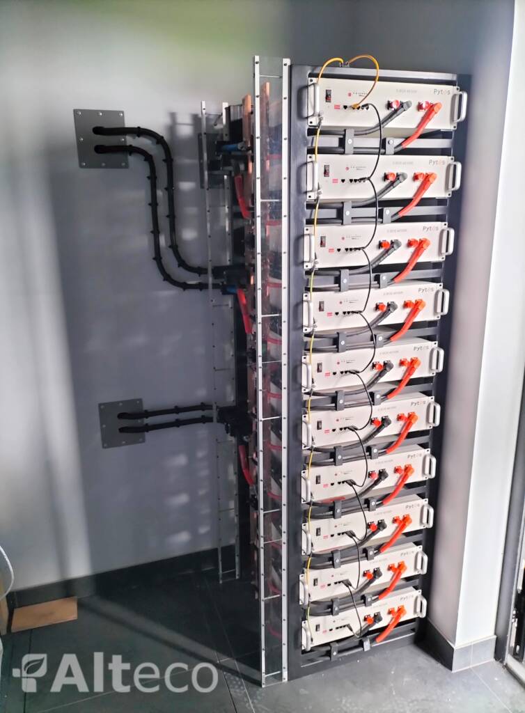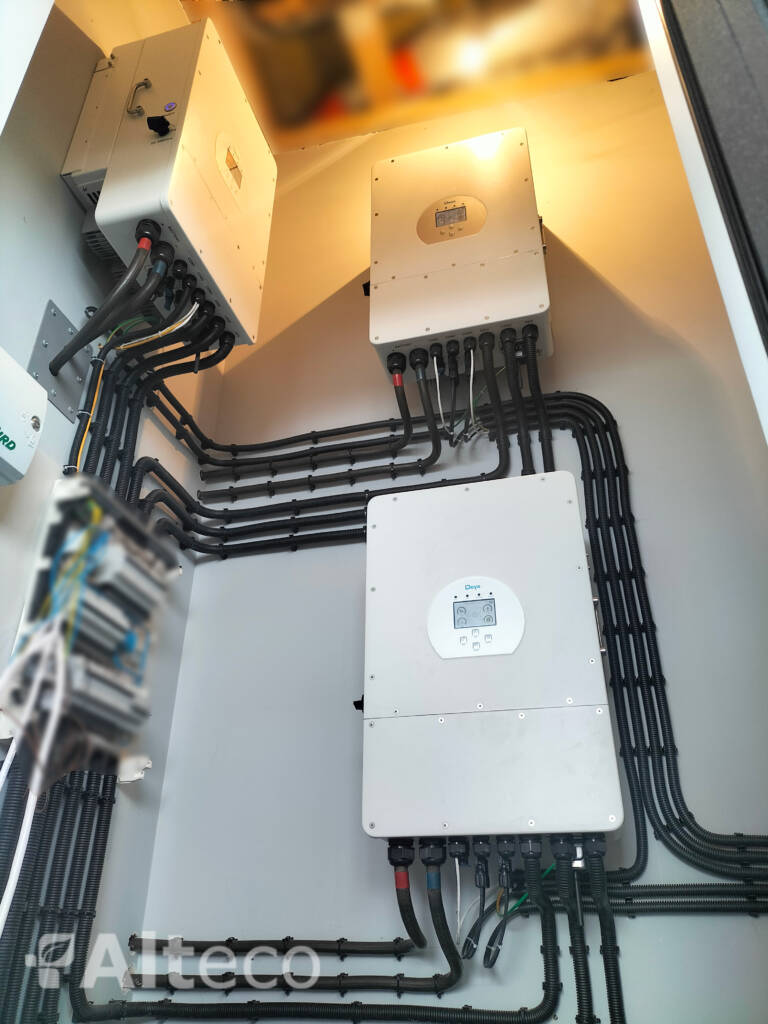 Учитывая существенные нагрузки потребителей, были использованы три трех фазных инвертора Deye общей мощностью 36 kW и литий-железо-фосфатные (LFP) аккумуляторные батареи Pytes емкостью 51 kW⋅h. Настроена зарядка АКБ от дизель-генератора и удаленный мониторинг.