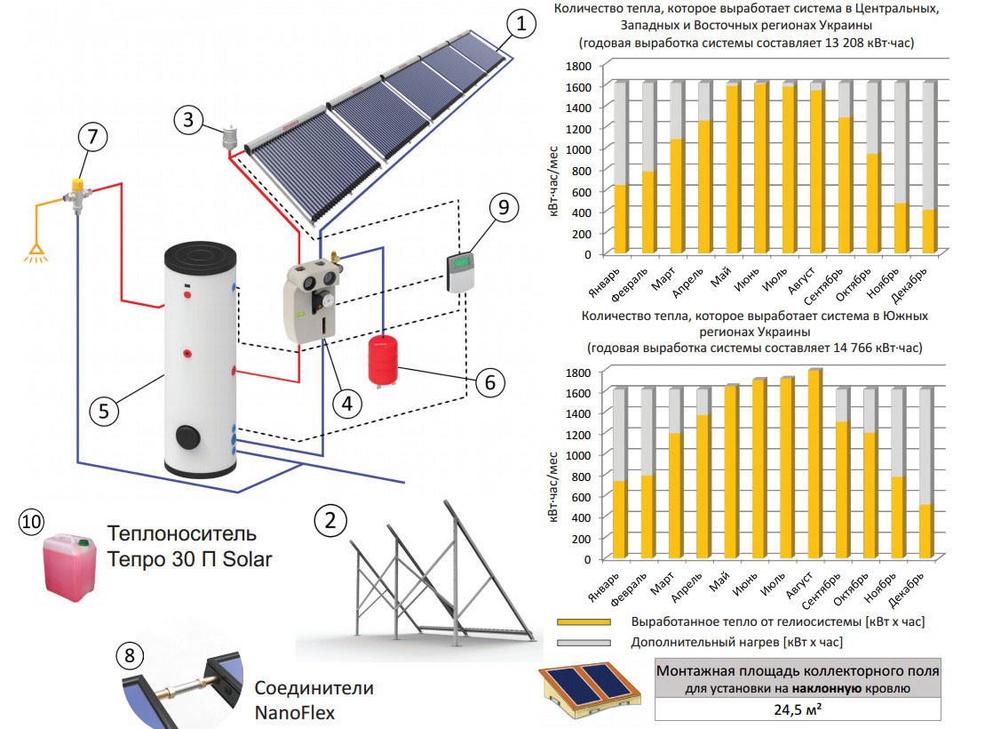 * — Стоимость дополнительных материалов для монтажа гелиосистемы (трубы, краны, муфты, обратные клапаны, изоляция и т.п.)составляет около 10-20% от стоимости оборудования.