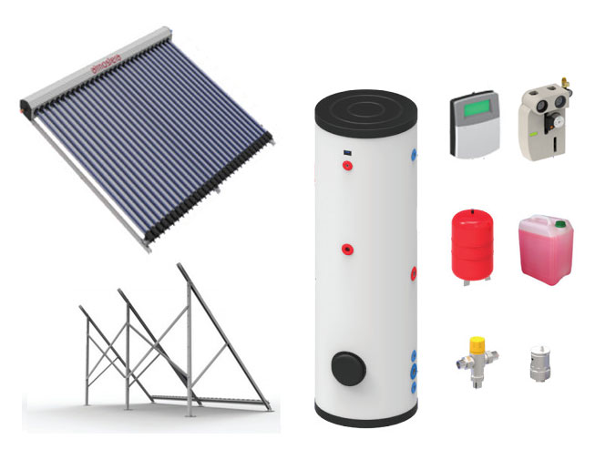 Готовая гелиосистема для установки на объектах круглогодичного пользования. Система применяется для горячего водоснабжения дачи, коттеджа, индивидуальной установки в квартиру и других объектов с потребностями в горячей воде.