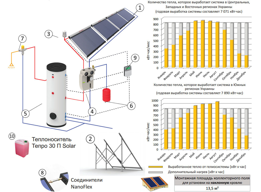 * — Стоимость дополнительных материалов для монтажа гелиосистемы (трубы, краны, муфты, обратные клапаны, изоляция и т.п.)составляет около 10-20% от стоимости оборудования.