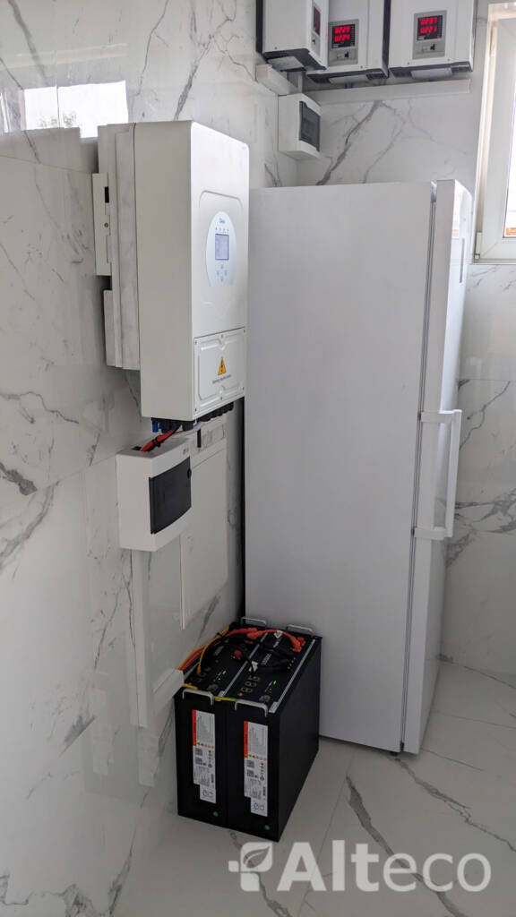 Нижче наводимо приклад збалансованої такої системи. Це інвертор, потужністю 5-6 кВт та акумуляторна батарея з енергоємністю 9-12 кВт*год.